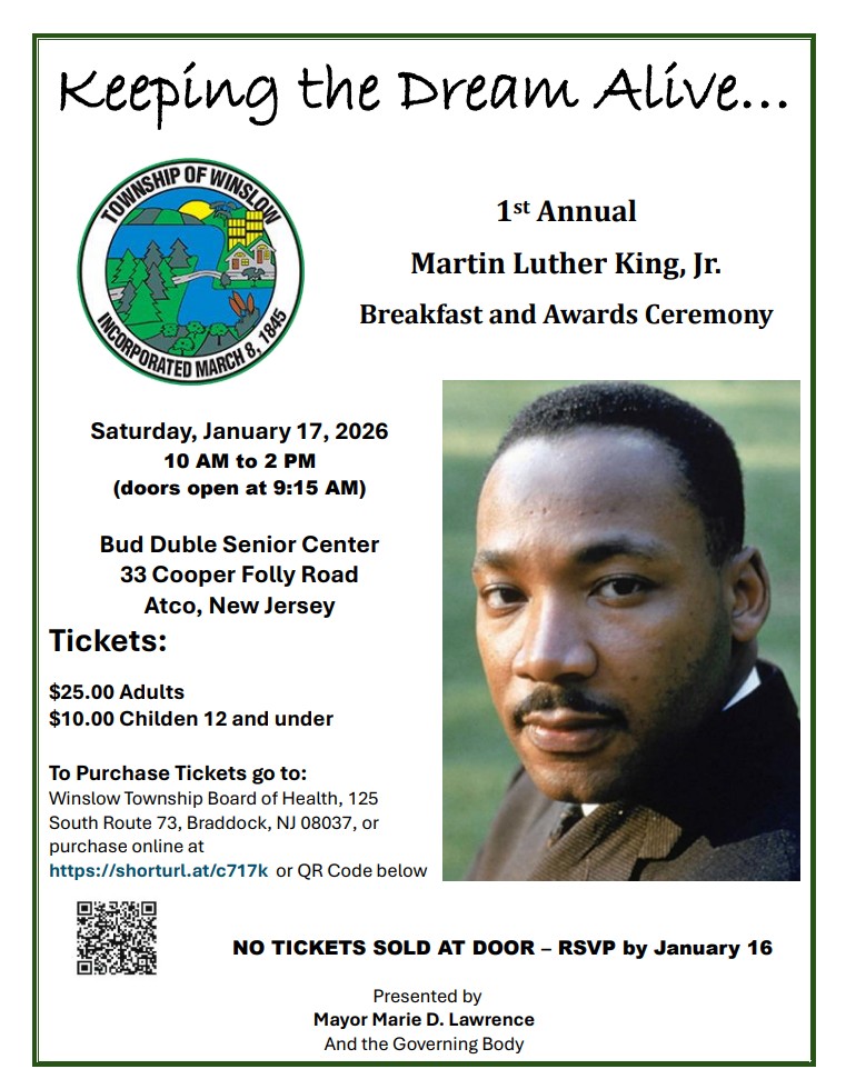 Celebrate the legacy of trailblazers at Winslow Township’s 1st Annual Dr. Martin Luther King Jr. Breakfast and Award Ceremony. Join us at the Bud Duble Center in Atco for brunch and community honors.