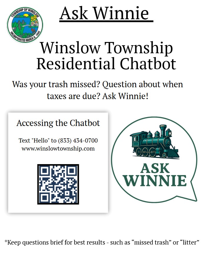 Access the chatbot on the township website www.winslowtownship.com or by texting "hello" to 833-434-0700